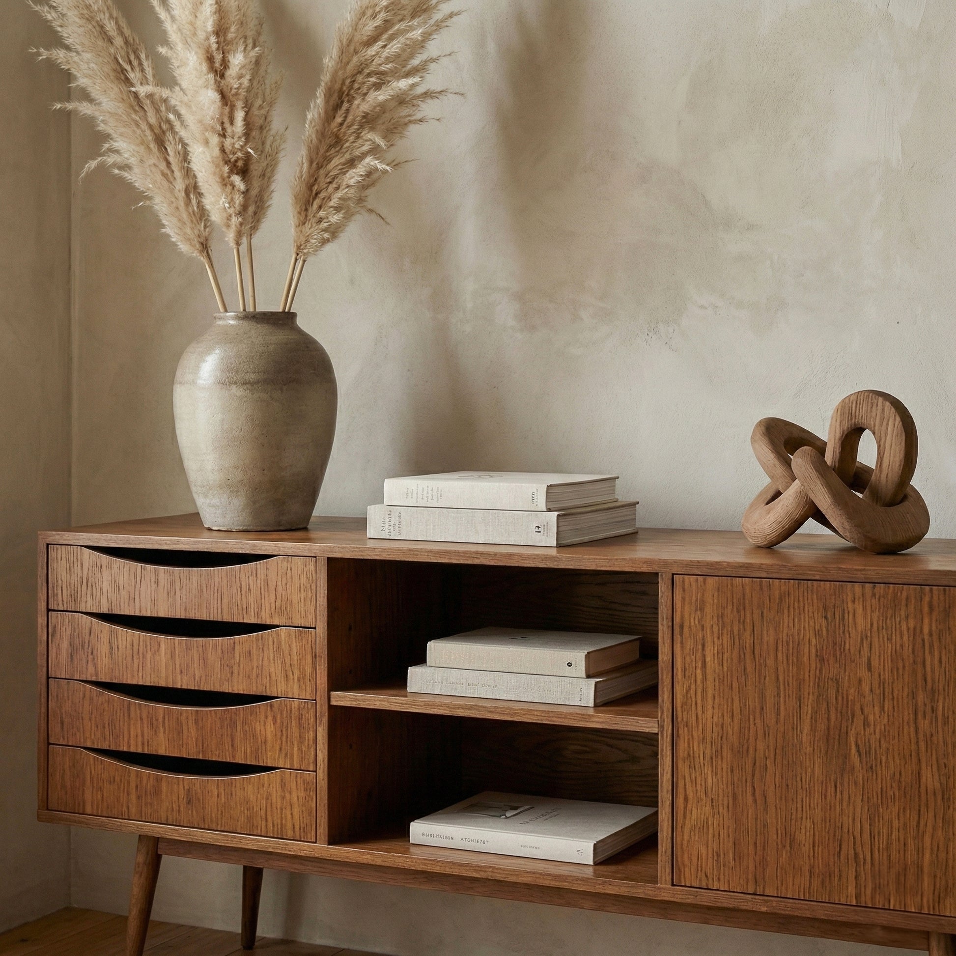 De golvende lijnen van de handgrepen en de slanke poten geven het LOTV CLASSY dressoir een uniek ritme. De doordachte indeling van lades en planken maakt het tot een praktisch meubelstuk met een ziel. Perfect voor ruimtes waarin functie en vorm samenkomen.