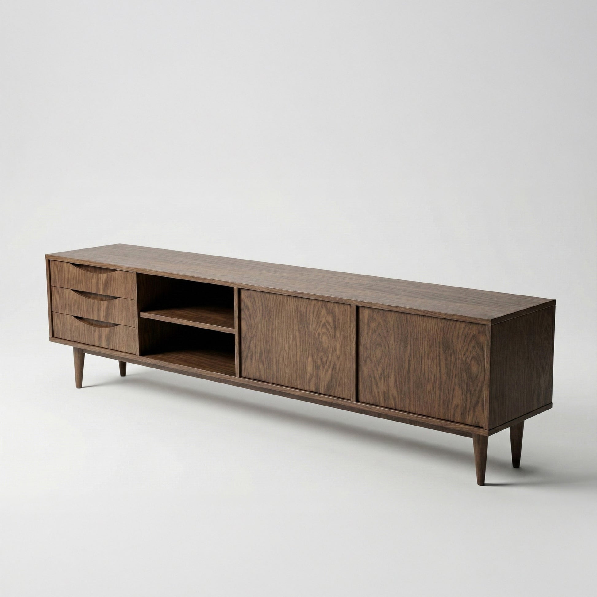 De RUNO TV + is een waar eerbetoon aan de jaren zestig – een tijdperk dat bekendstaat om zijn uitgesproken elegantie en iconisch design. Dit meubelstuk combineert een minimalistische vorm met de warmte van natuurlijk hout en een subtiele retro-esthetiek. Het resultaat is een tijdloos object dat designliefhebbers al generaties lang weet te raken.