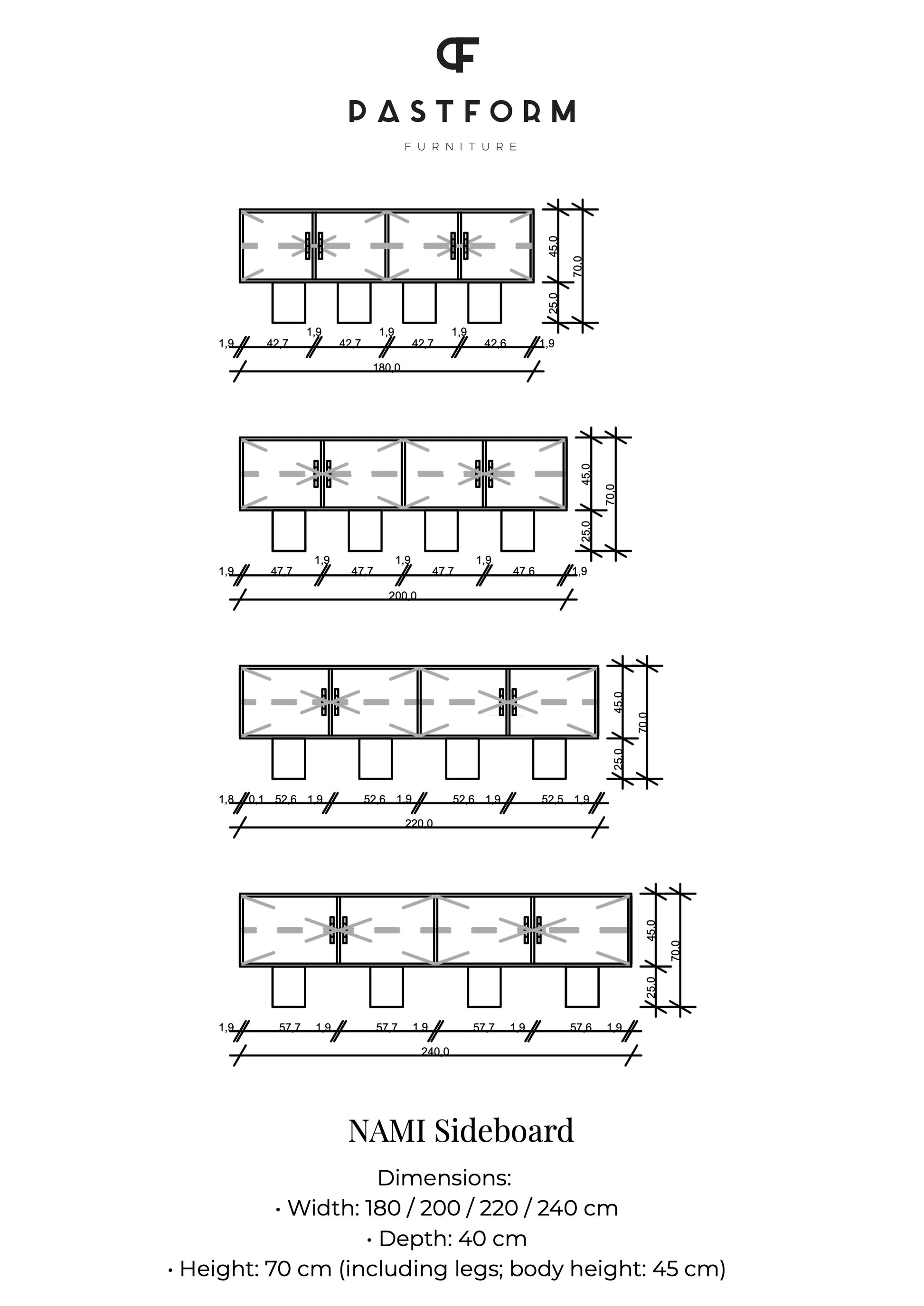 The NAMI sideboard combines clean lines with bold, sculptural legs, turning storage into a statement. Its rhythmic wooden fronts, adorned with distinctive round handles, highlight the natural beauty of veneer and craftsmanship. Behind each door, adjustable and removable shelves offer full freedom in arranging the interior – a balance of function and design.