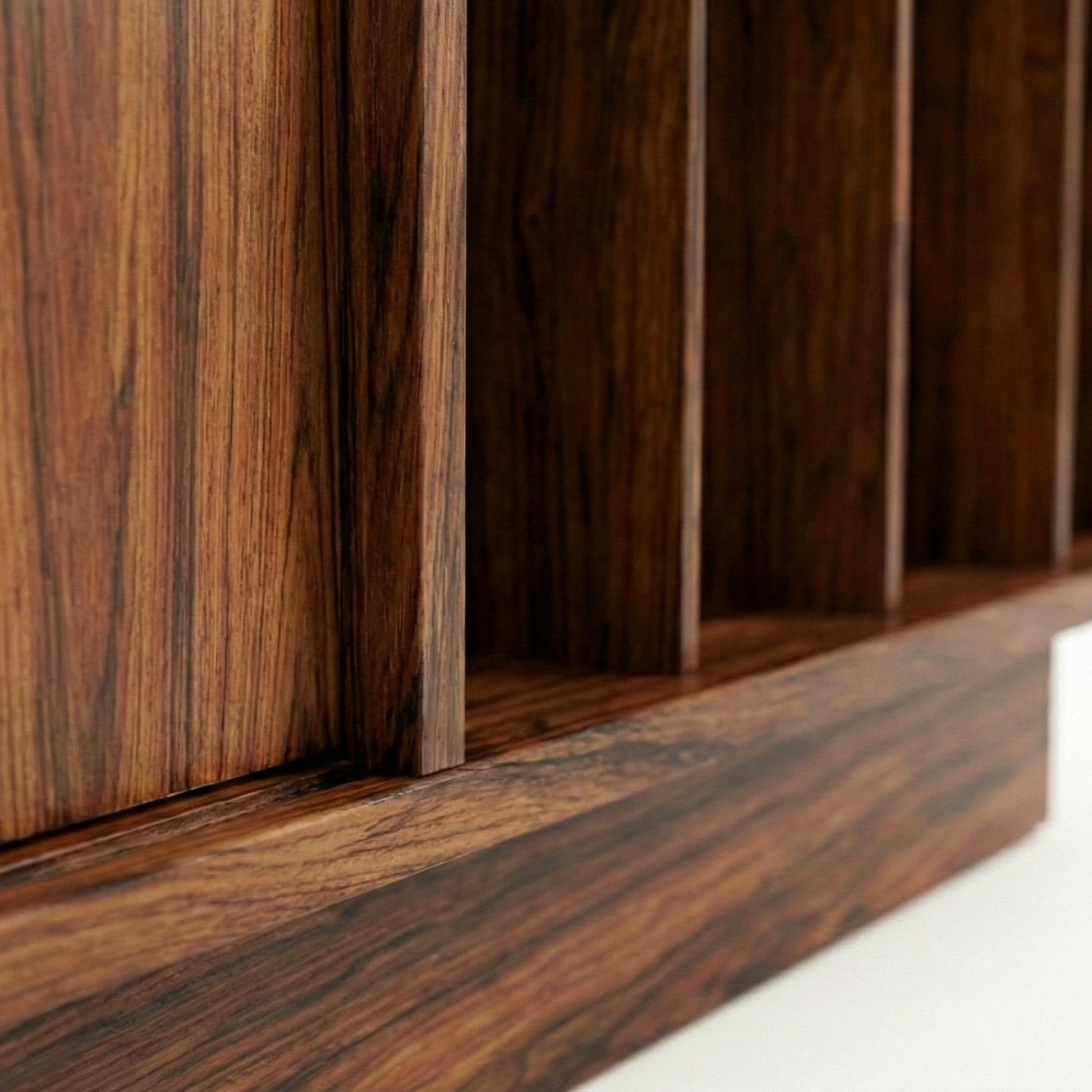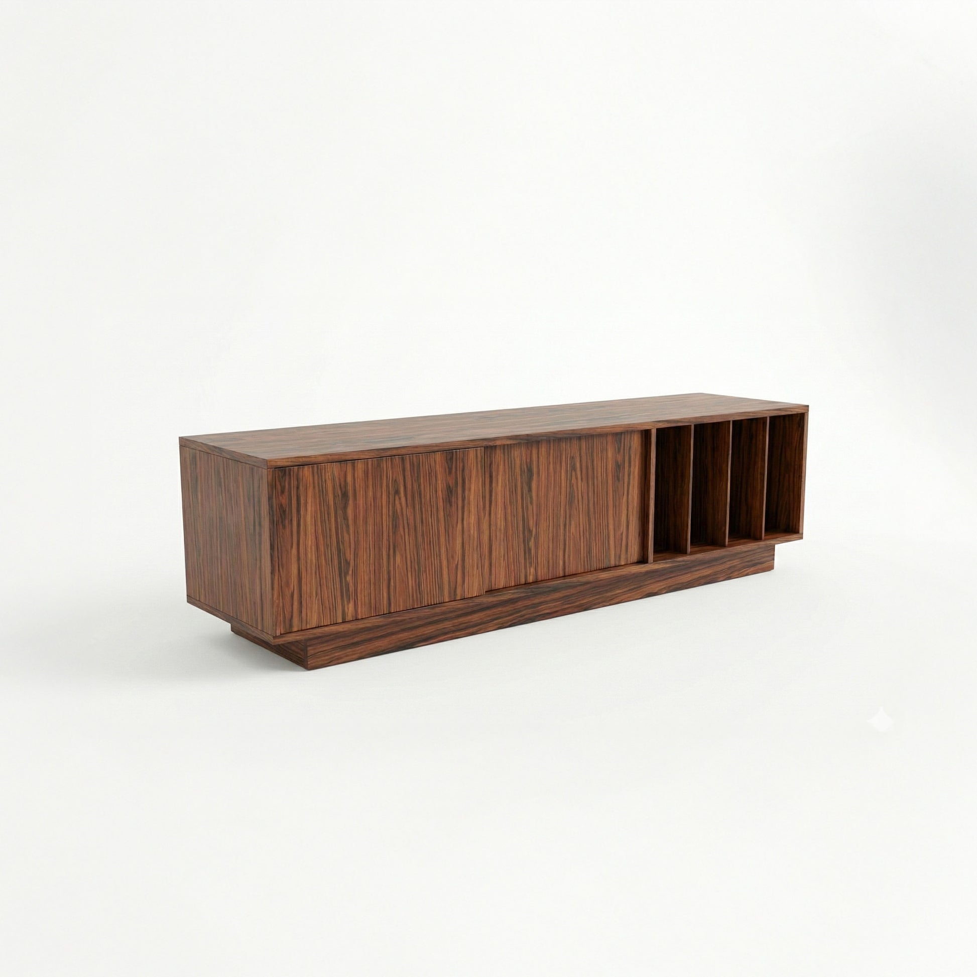 Het dressoir is ontworpen met twee schuifdeuren, waarachter zich twee ruime legplanken bevinden voor dagelijks gebruik. Aan de rechterzijde zorgen vier speciale vakken voor vinylplaten voor een functionele en visueel uitgebalanceerde indeling, perfect voor muziekliefhebbers en verzamelaars.